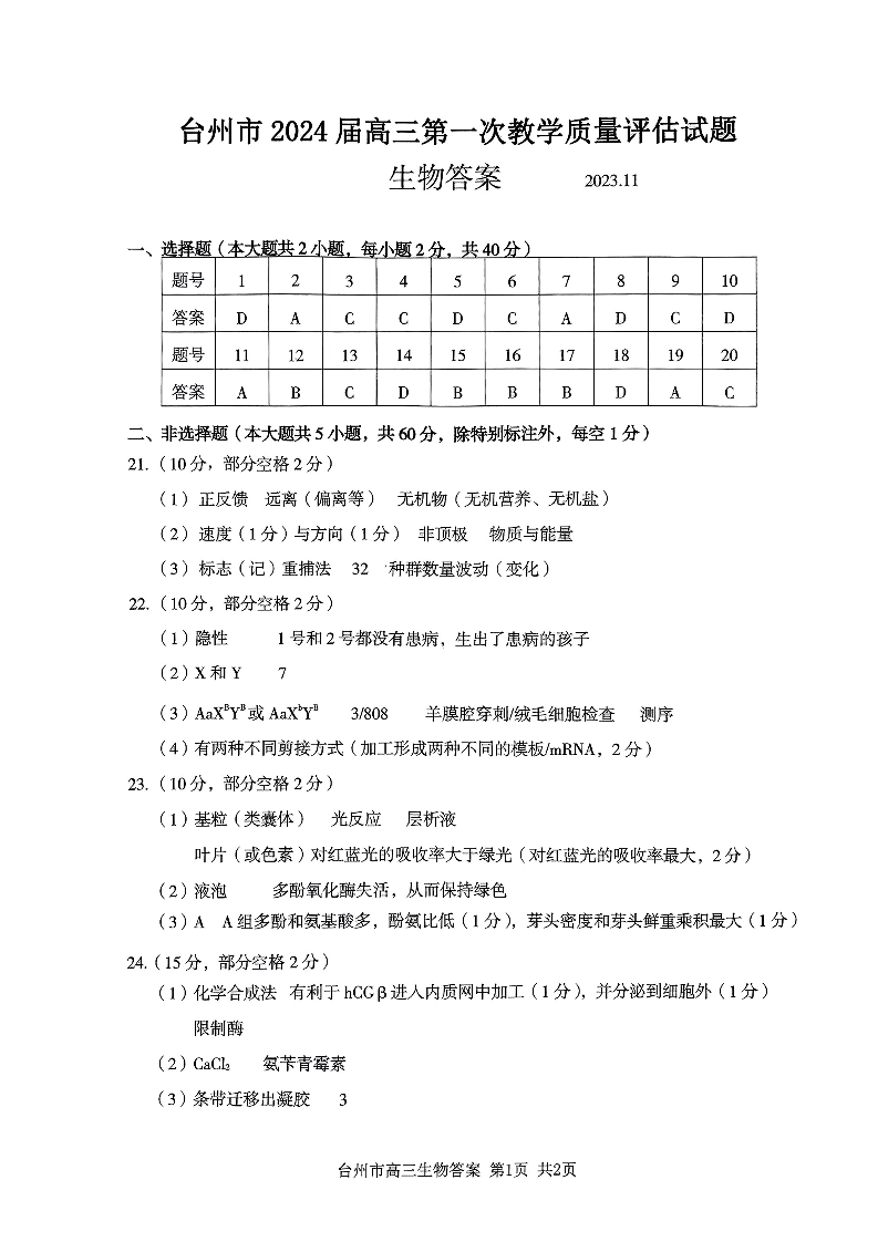 台州市2024届高三第一次教学质量评估试题 生物答案