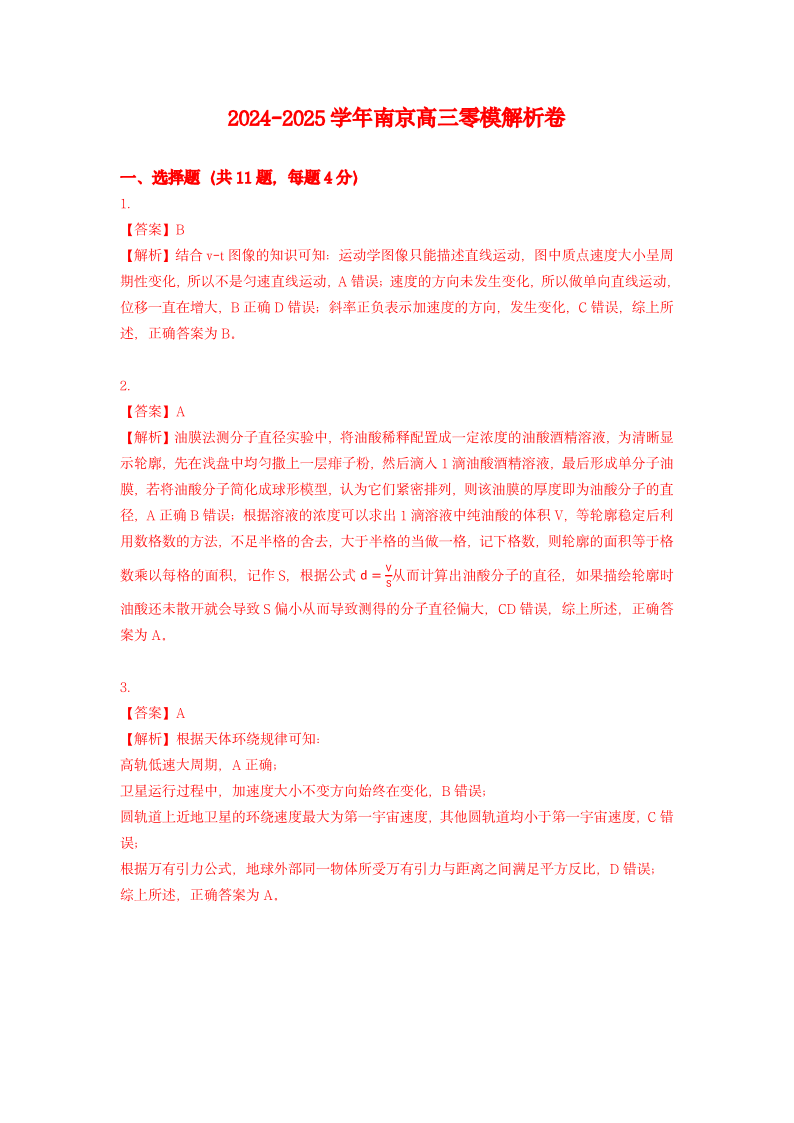 江苏省南京市2025届高三年级学情调研+物理答案