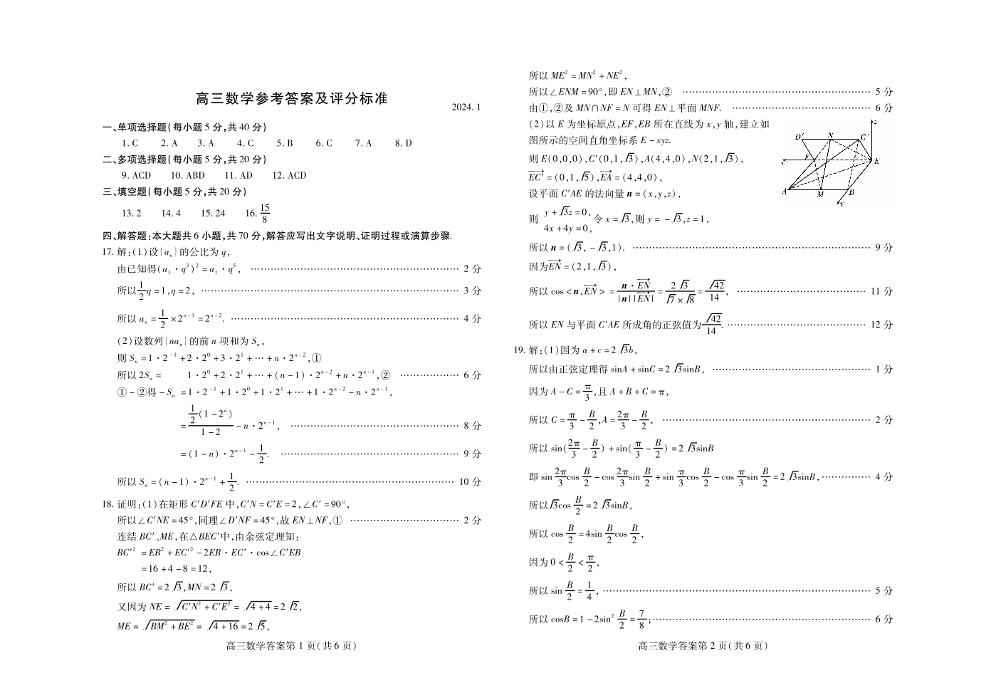 2山东省潍坊市2024.1高三年级期末考试数学答案