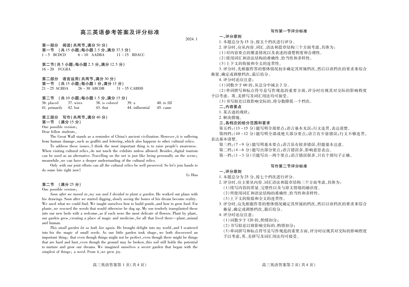 3山东省潍坊市2024.1高三年级期末考试英语答案