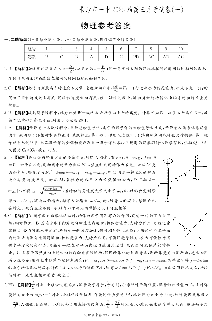 湖南省长沙市第一中学2025届高三上学期月考卷(一)物理答案