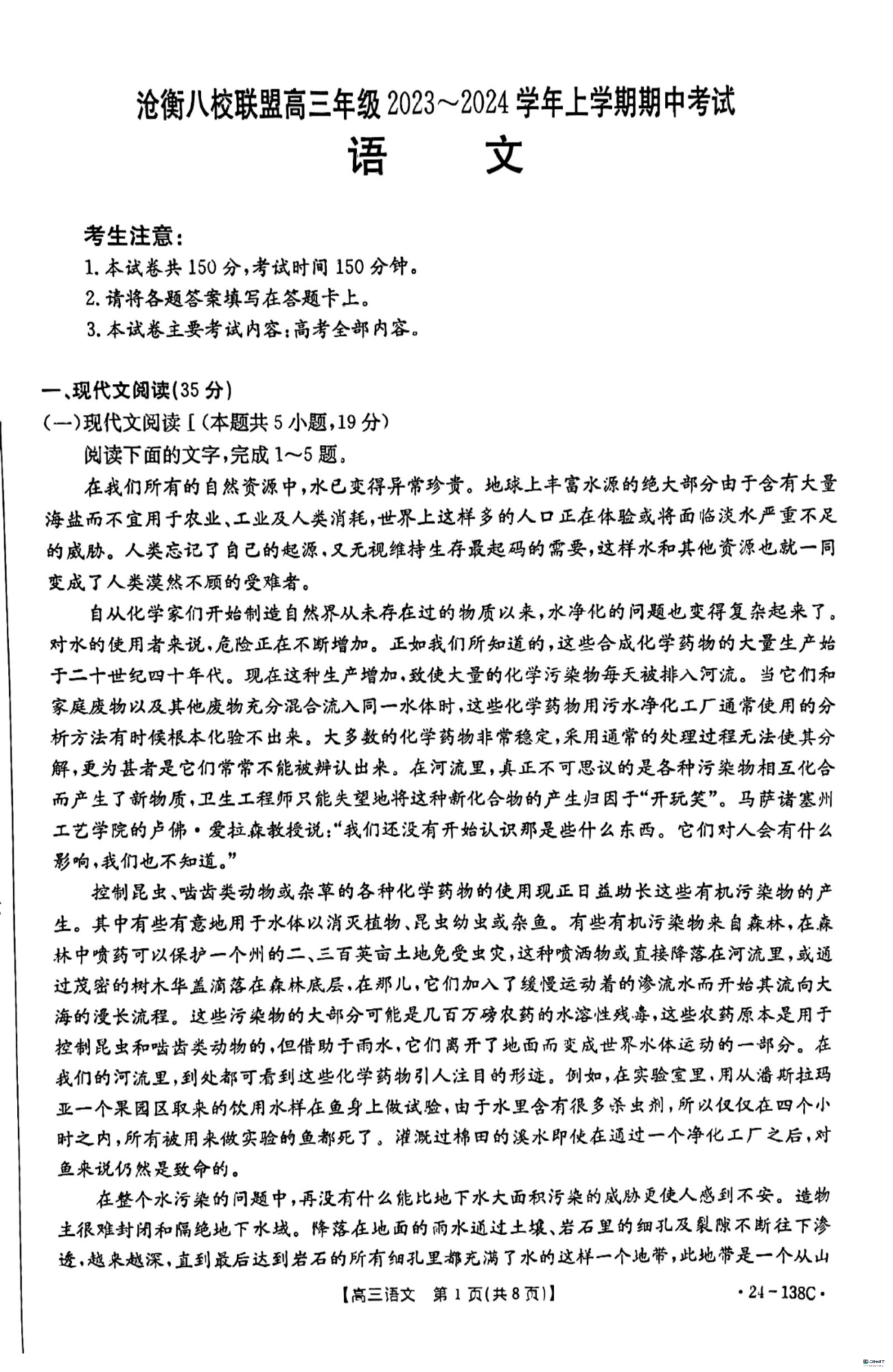 河北省沧衡八校联盟2023-2024学年高三上学期11月期中考试 语文
