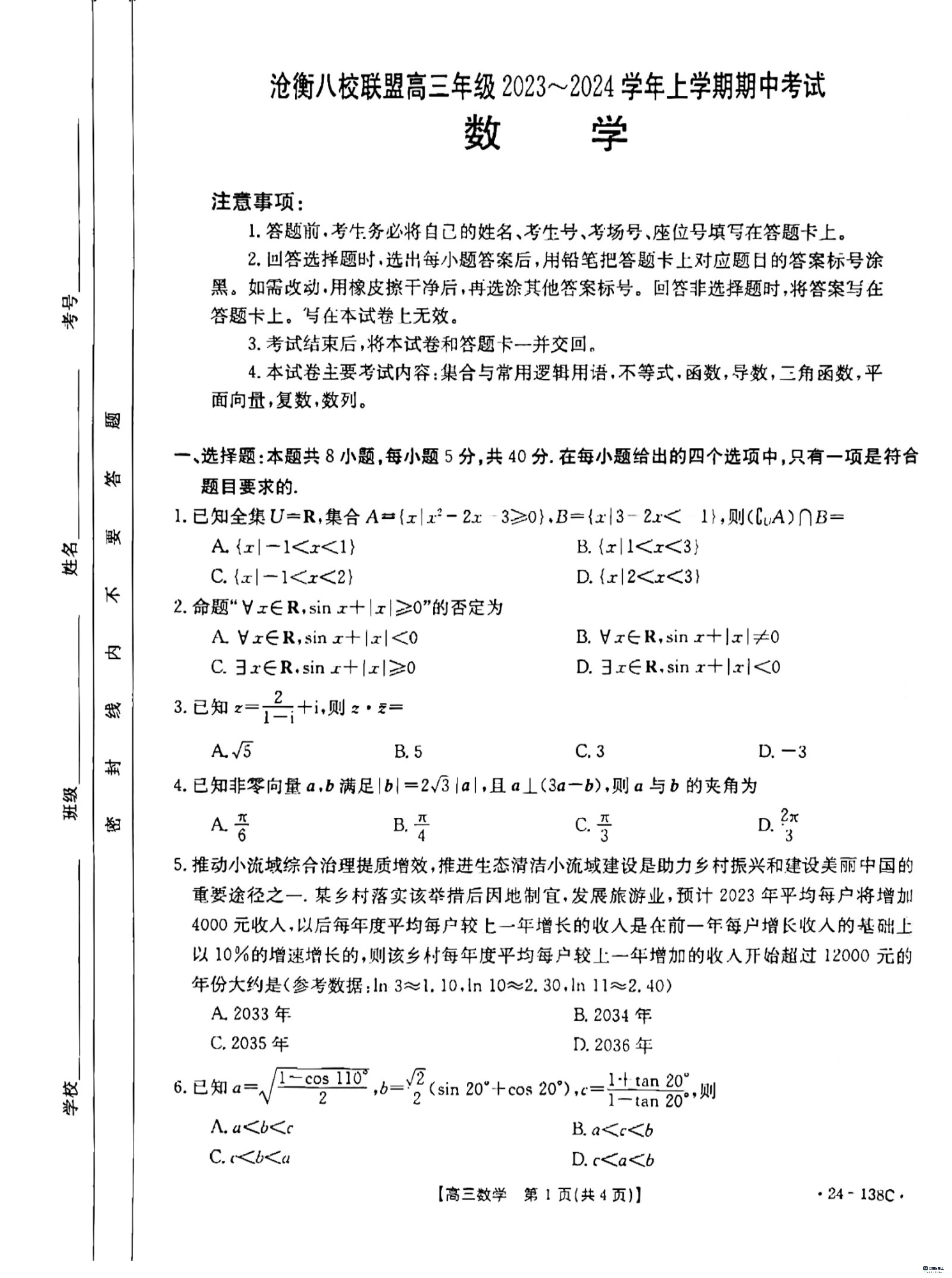 河北省沧衡八校联盟2023-2024学年高三上学期11月期中考试 数学