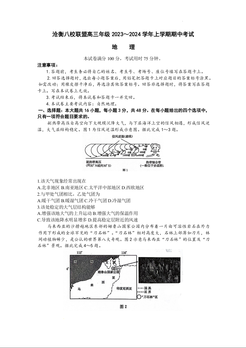 河北省沧衡八校联盟2023-2024学年高三上学期11月期中考试 地理