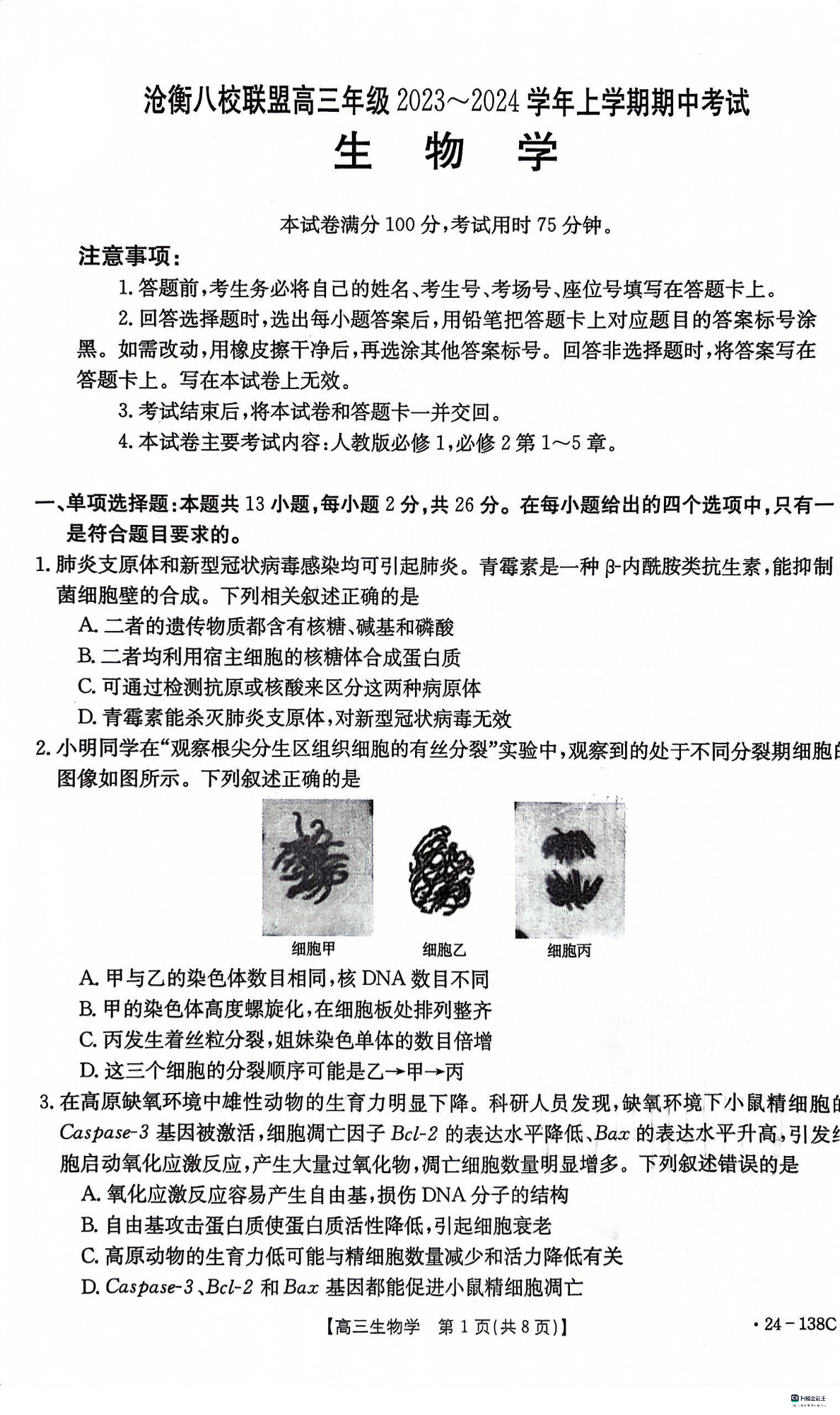 河北省沧衡八校联盟2023-2024学年高三上学期11月期中考试 生物