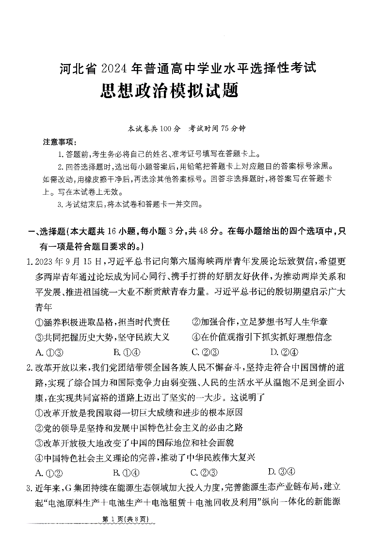 2024届河北省高三下学期普通高中学业水平选择性考试 政治