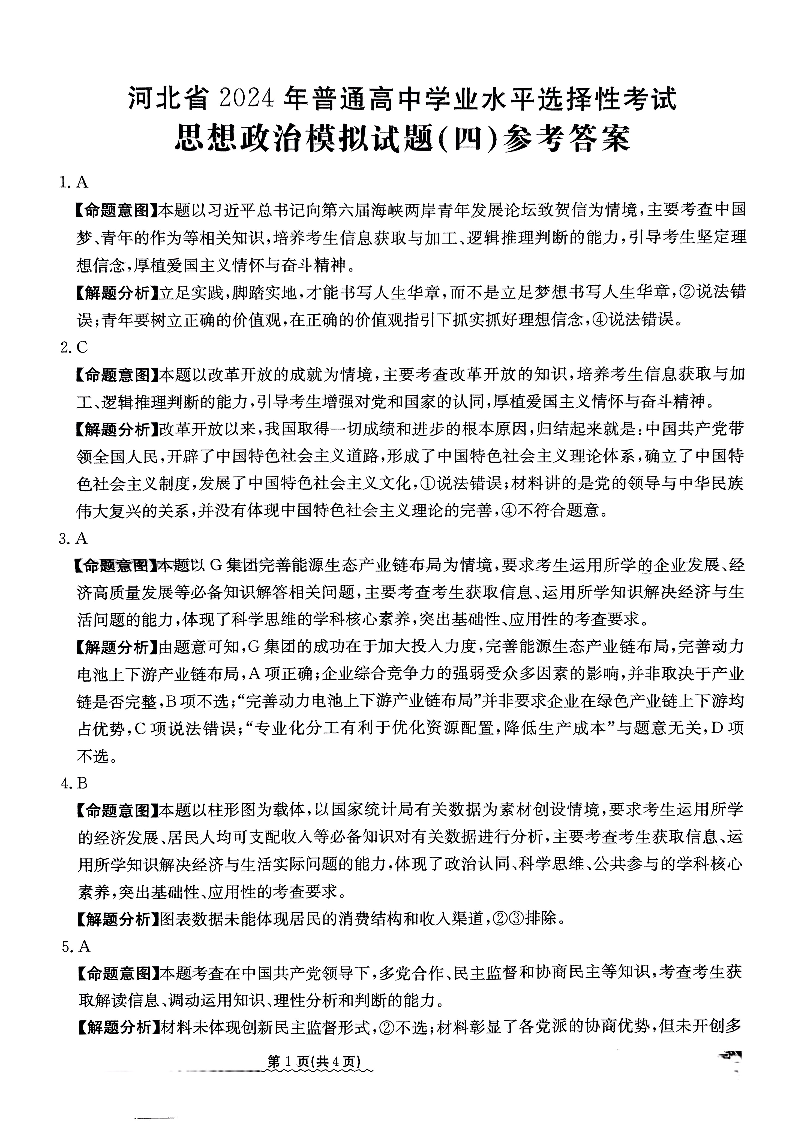 2024届河北省高三下学期普通高中学业水平选择性考试 政治参考答案