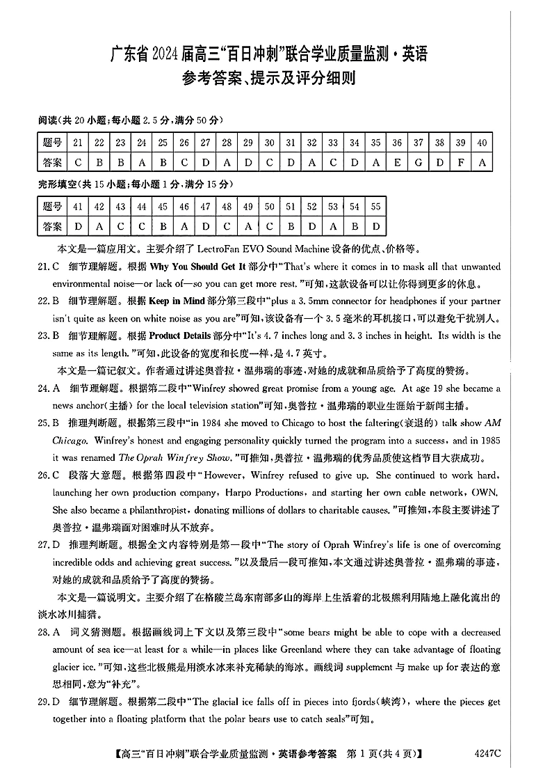 2024届广东省高三“百日冲刺”联合学业质量监测(一模)英语答案
