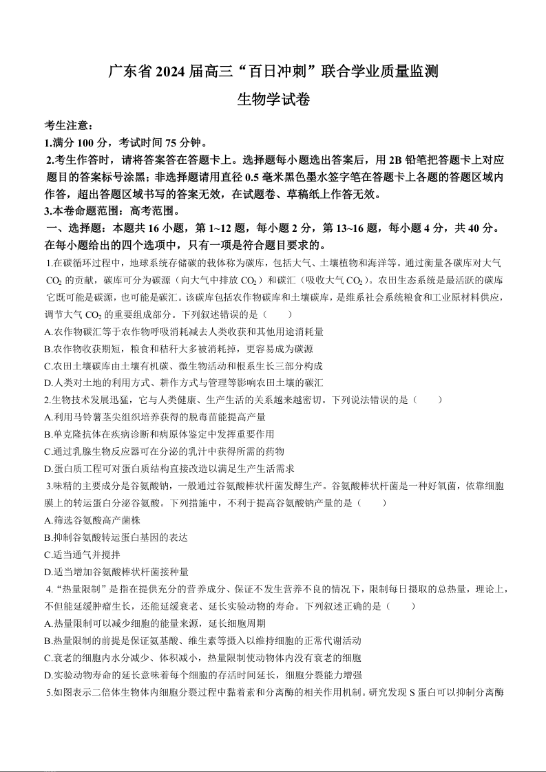 2024届广东省高三“百日冲刺”联合学业质量监测(一模)生物