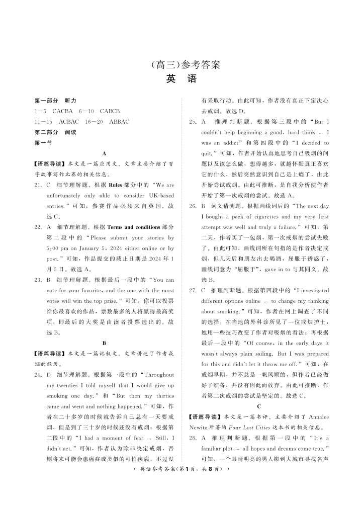 11月高三联考英语答案