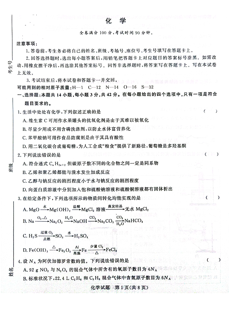 河南省周口市项城市期中联考2023-2024学年高三上学期11月期中试卷 化学