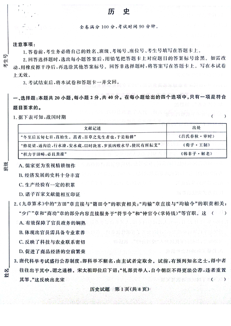 河南省周口市项城市期中联考2023-2024学年高三上学期11月期中试卷 历史
