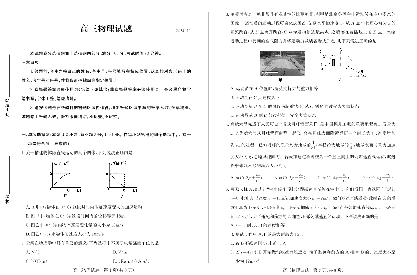 【山东卷】山东省德州市2024.11高三年级期中统一检测物理