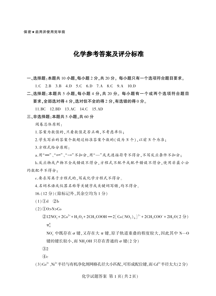 临沂市2024.11高三年级期中教学质量检测考+化学答案