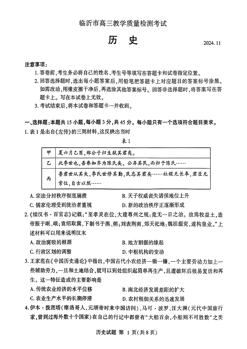 临沂市2024.11高三年级期中教学质量检测考+历史
