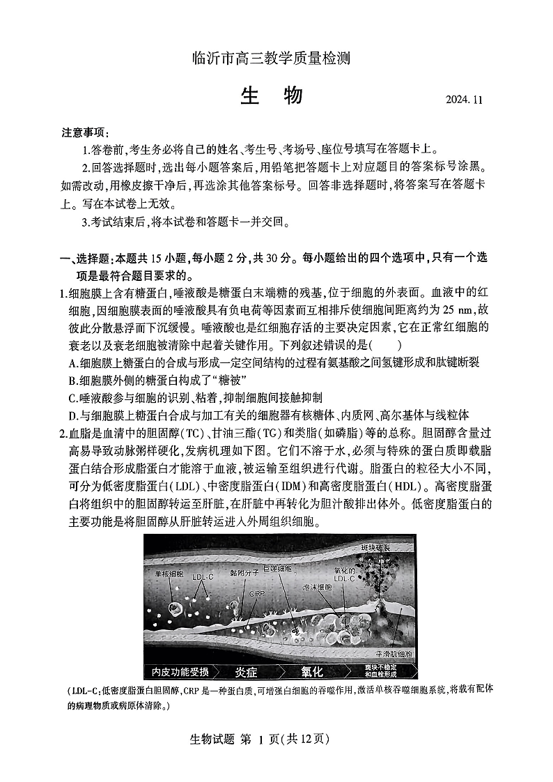 临沂市2024.11高三年级期中教学质量检测考+生物