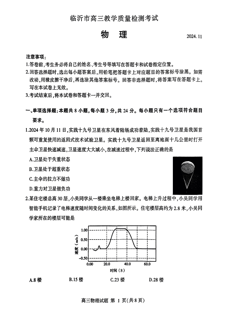 临沂市2024.11高三年级期中教学质量检测考+物理