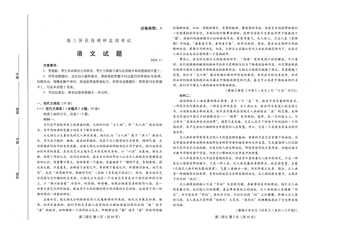 山东省潍坊市2024.11高三阶段性调研监测考试语文