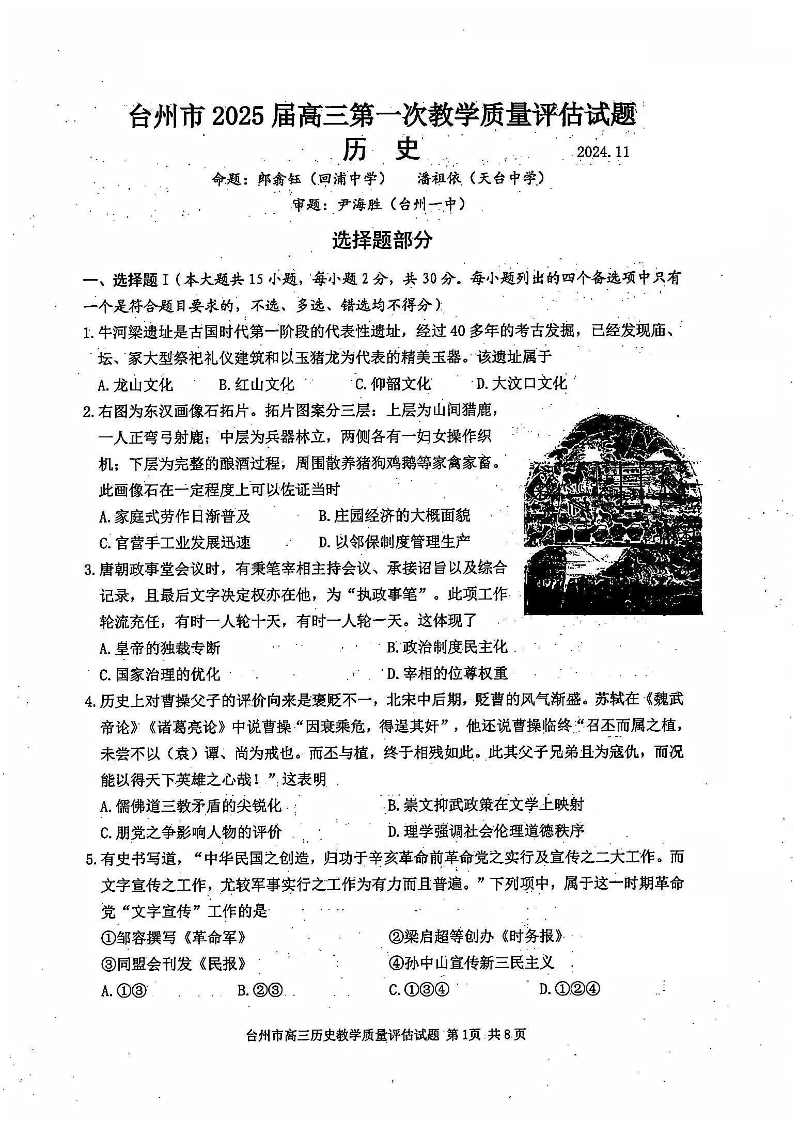 浙江省台州市2025届高三第一次教学质量评估历史+答案