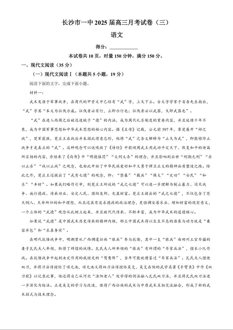 湖南省长沙市一中2025届高三月考试卷(三)语文
