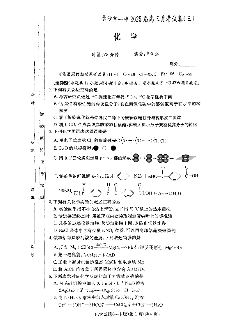 湖南省长沙市一中2025届高三月考试卷(三)化学