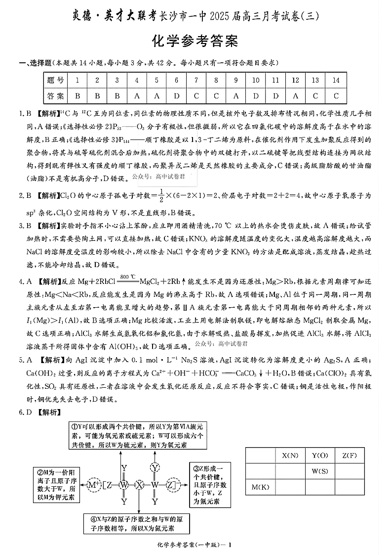 湖南省长沙市一中2025届高三月考试卷(三)化学答案
