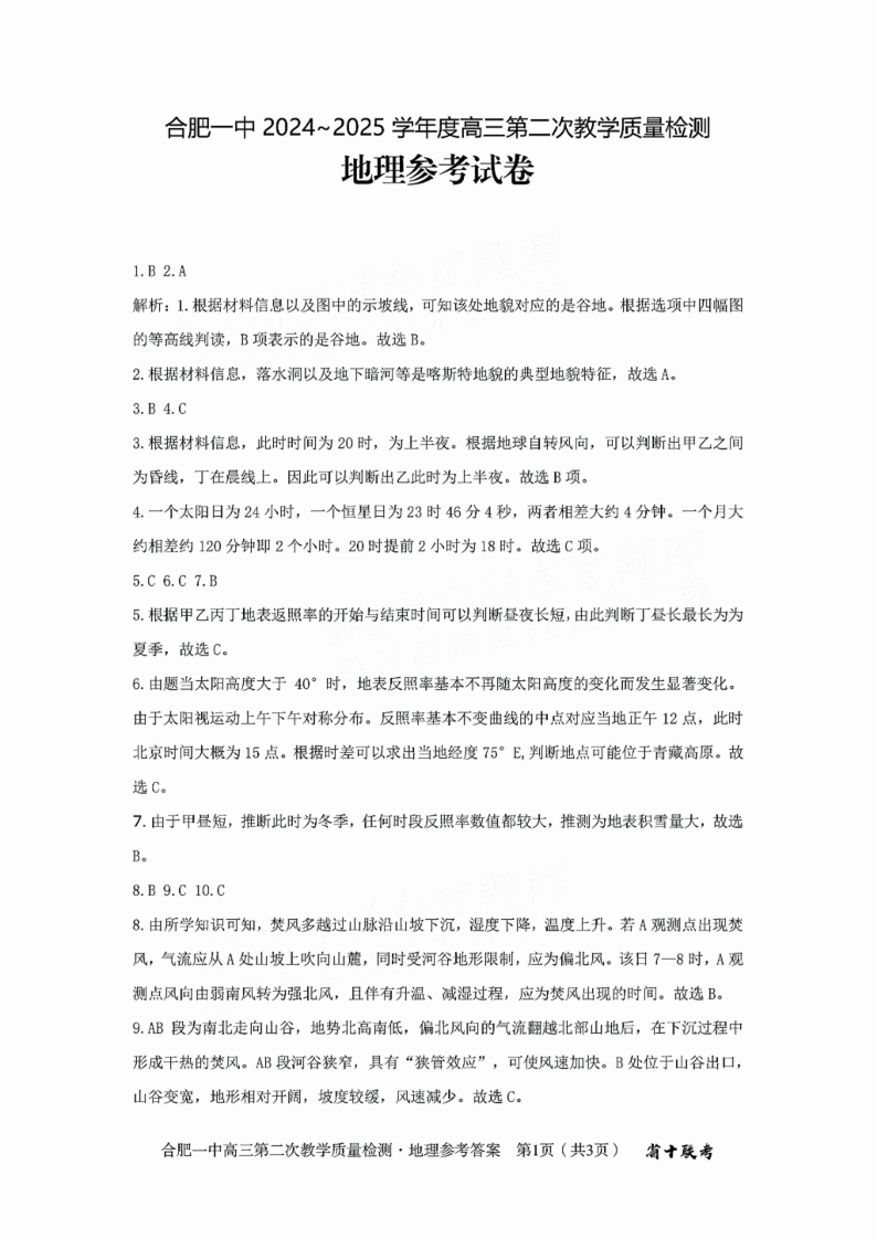安徽省合肥市第一中学2025届高三上学期第二次教学检测地理答案(十联考)