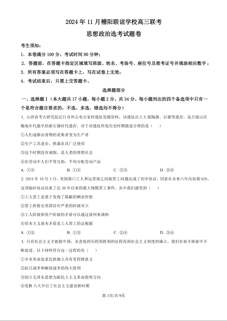 浙江省稽阳联谊学校2025届高三上学期11月联考政治(原卷版)