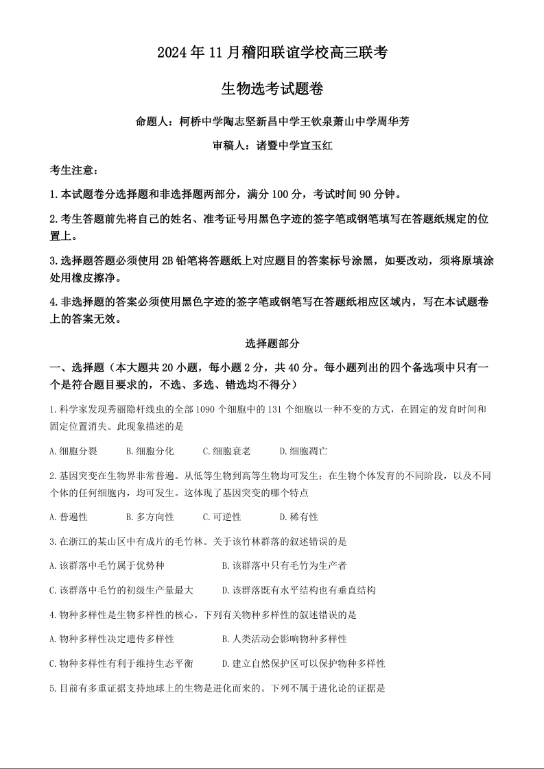 浙江省稽阳联谊学校2025届高三上学期11月联考生物+答案