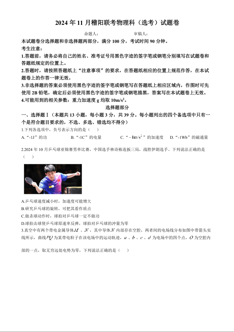 浙江省稽阳联谊学校2025届高三上学期11月联考物理+答案