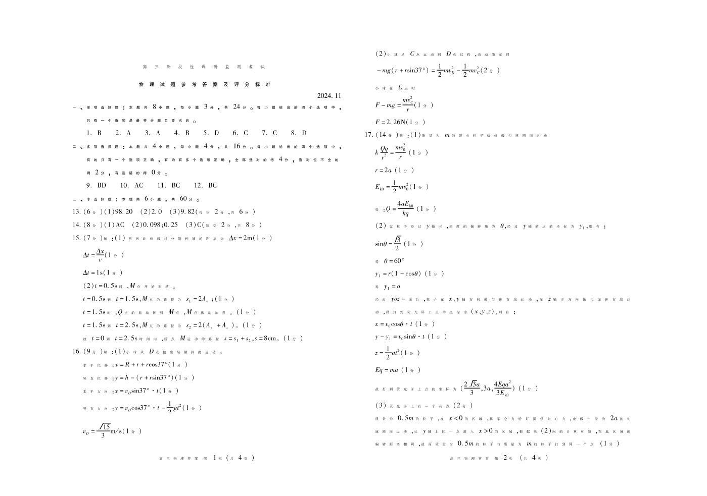 山东省潍坊市2024.11高三阶段性调研监测考试物理答案