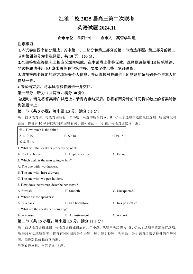 安徽省江淮十校2025届高三上学期第二次联考英语+答案