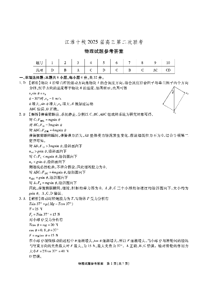 安徽省江淮十校2025届高三上学期第二次联考物理答案(A卷)
