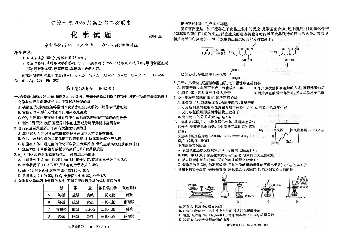 安徽省江淮十校2025届高三上学期第二次联考化学+答案
