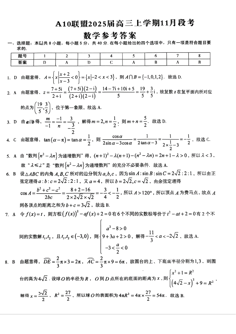 安徽省1号卷A10联盟2025届高三上学期11月段考数学答案