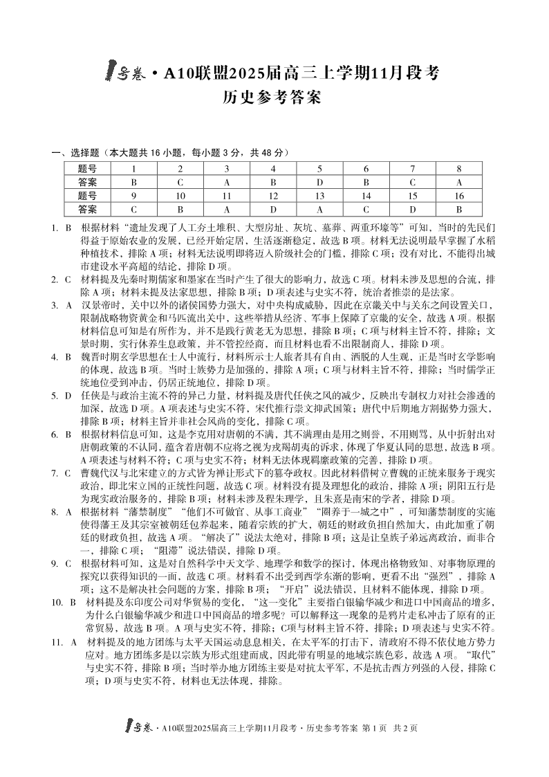 安徽省1号卷A10联盟2025届高三上学期11月段考历史答案