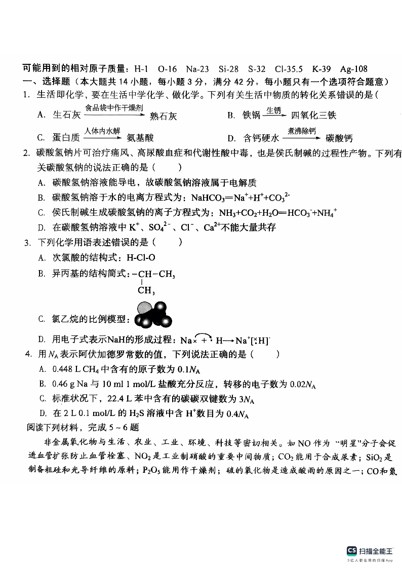 安徽省1号卷A10联盟2025届高三上学期11月段考化学