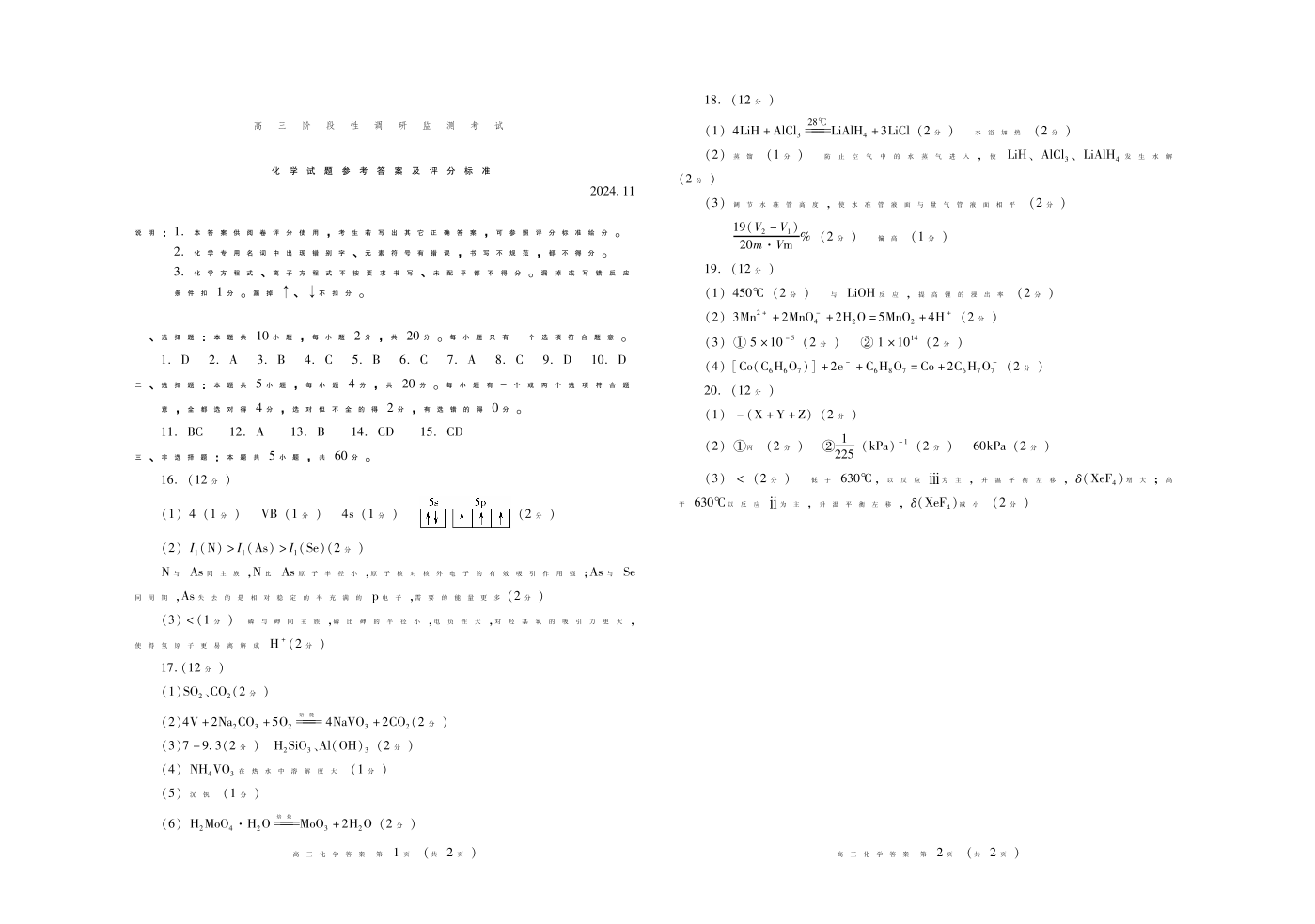 山东省潍坊市2024.11高三阶段性调研监测考试化学答案