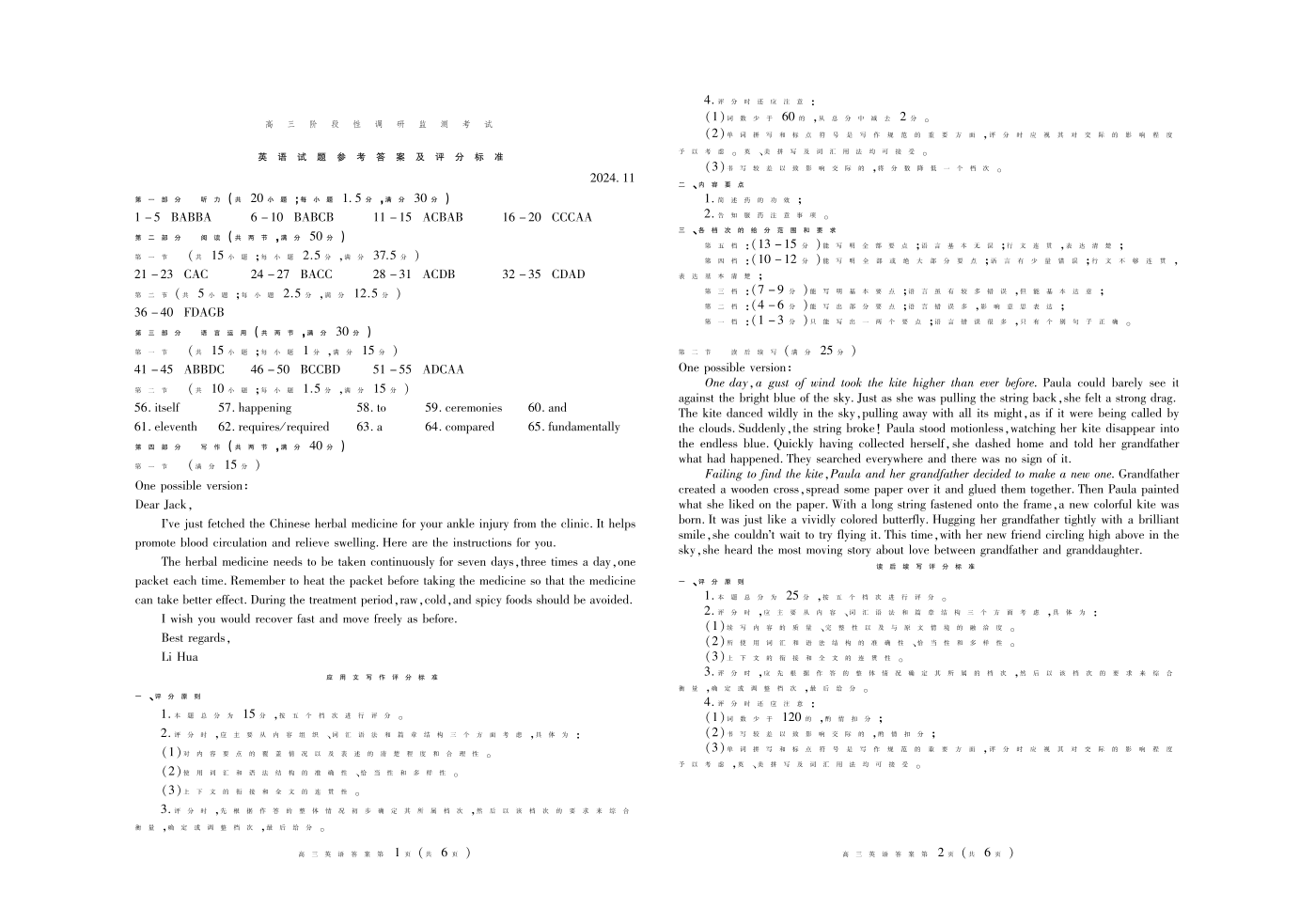 山东省潍坊市2024.11高三阶段性调研监测考试英语答案
