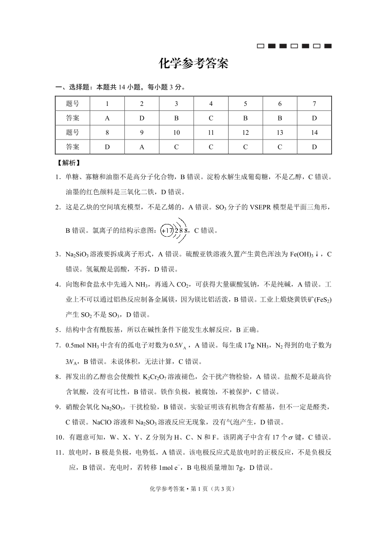 重庆巴蜀中学月考2025届高三适应性月考卷(三)化学答案