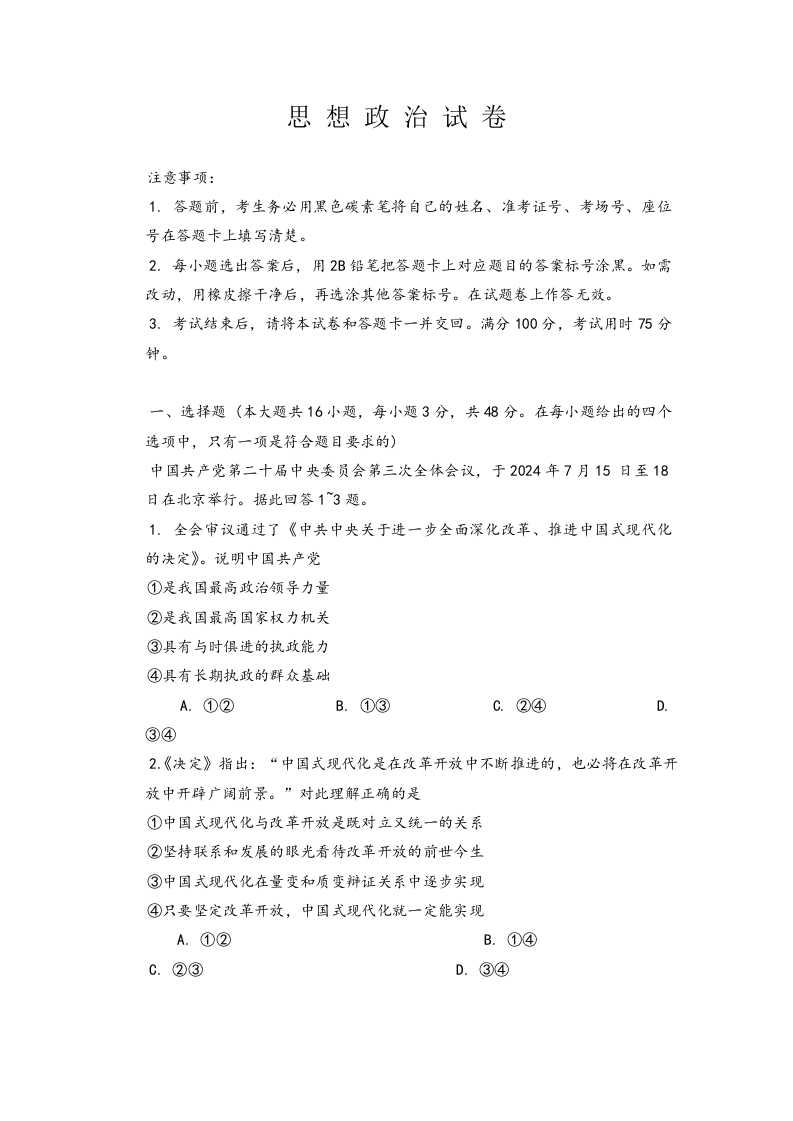 重庆巴蜀中学月考2025届高三适应性月考卷(三)政治
