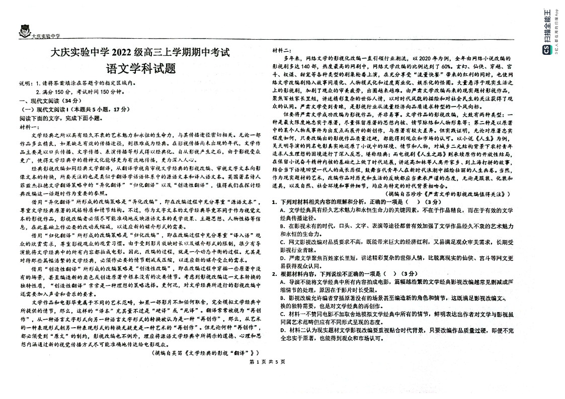 黑龙江省大庆市实验中学实验二部2025届高三上学期期中考试语文