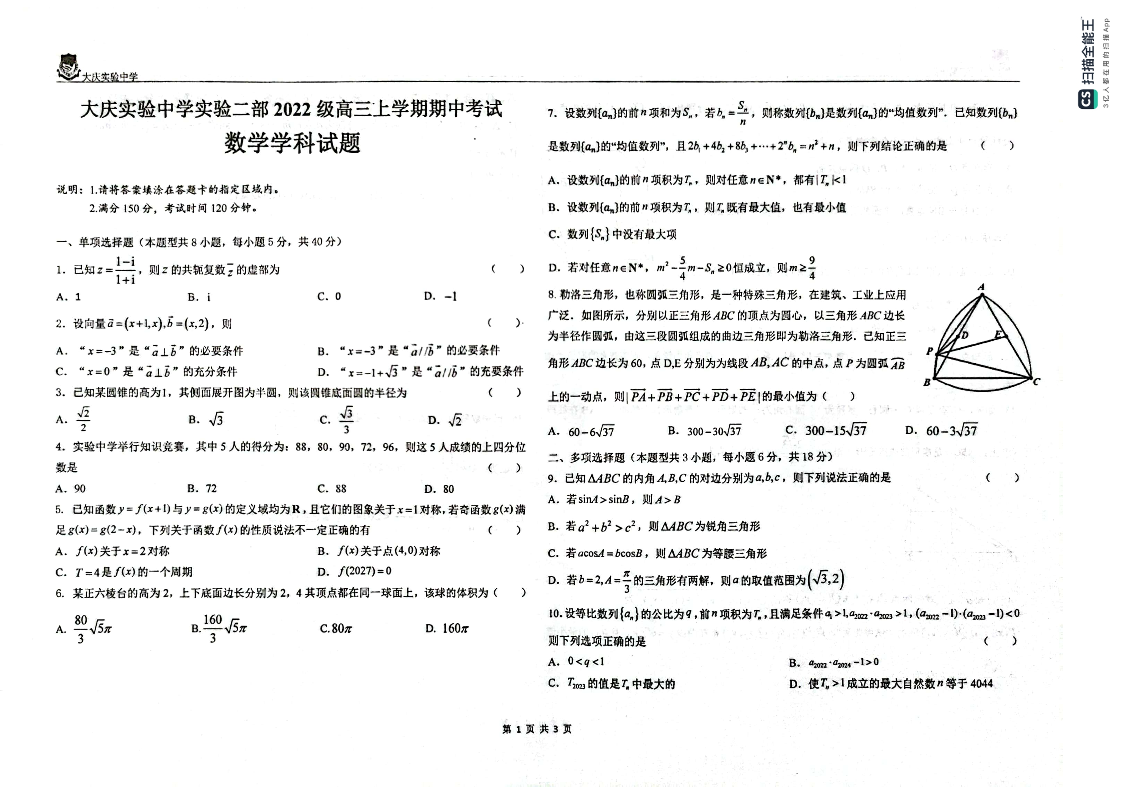 黑龙江省大庆市实验中学实验二部2025届高三上学期期中考试数学