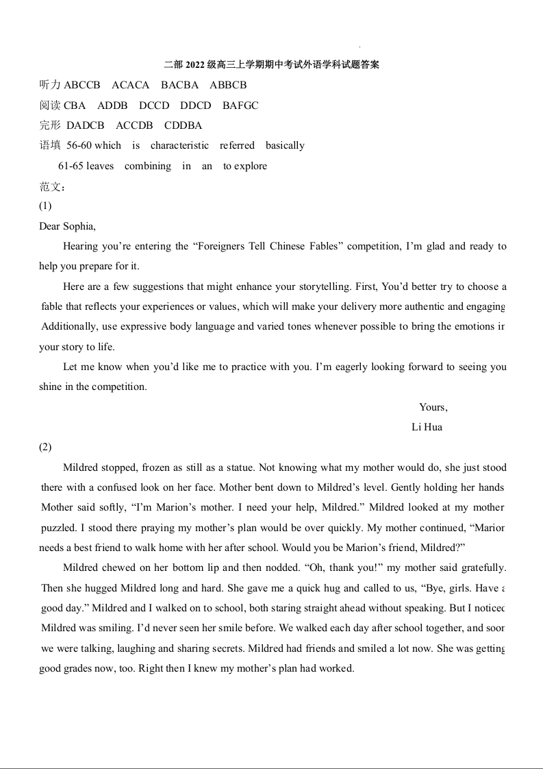 黑龙江省大庆市实验中学实验二部2025届高三上学期期中考试英语答案