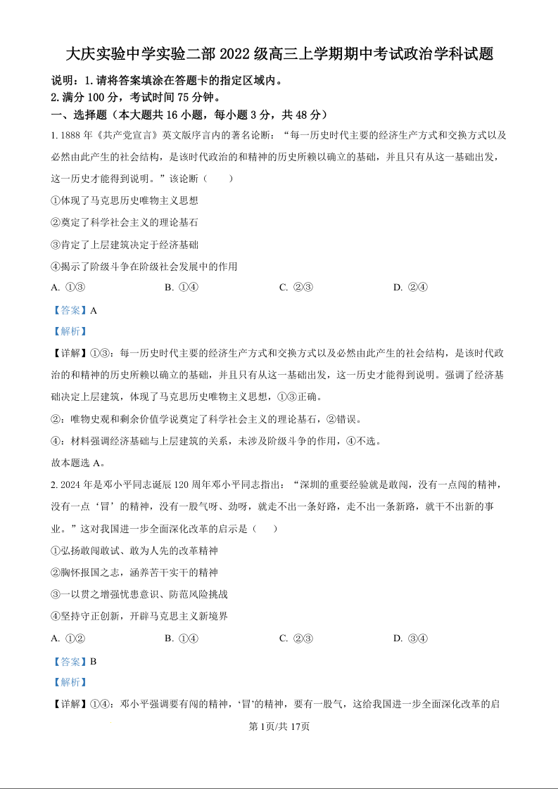 黑龙江省大庆市实验中学实验二部2025届高三上学期期中考试政治(精品解析版)