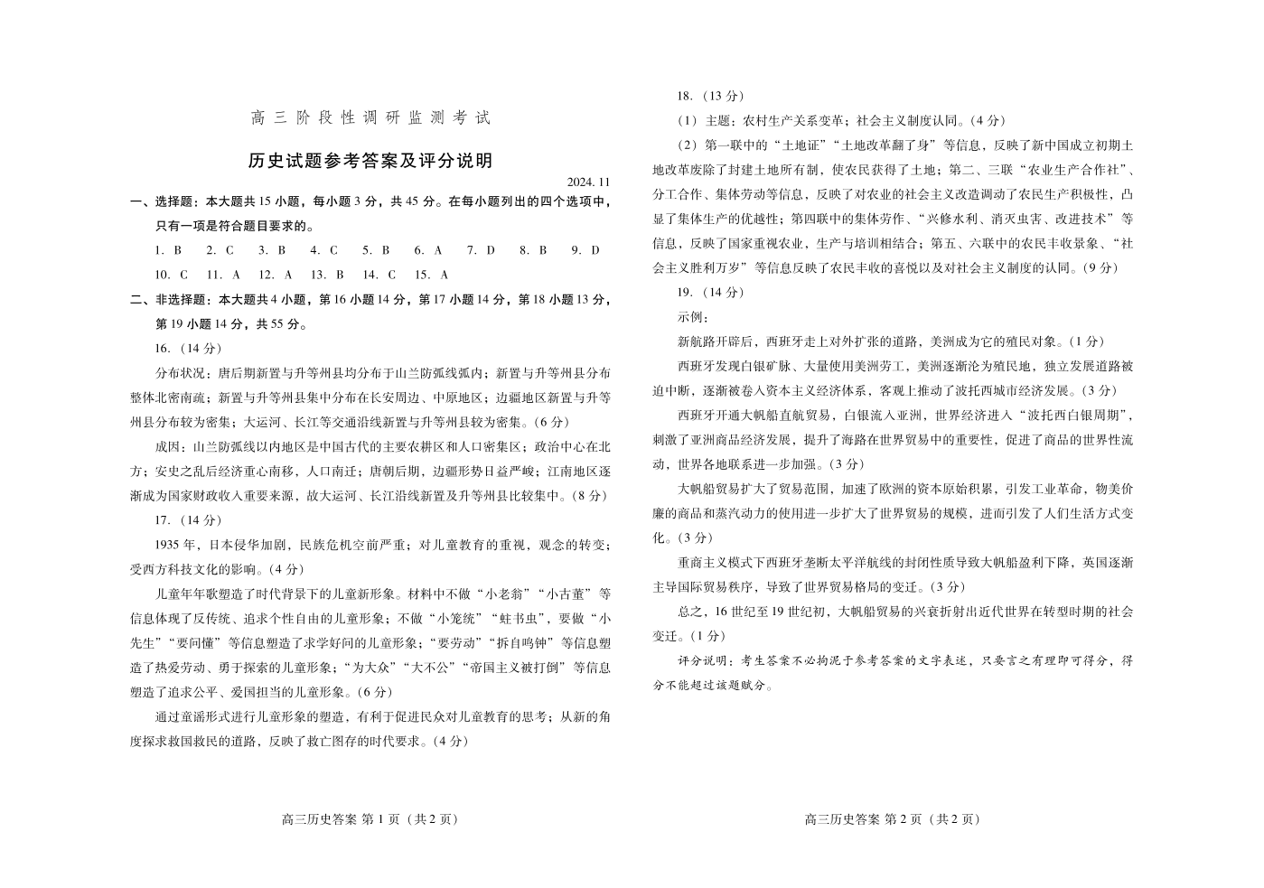 山东省潍坊市2024.11高三阶段性调研监测考试历史答案