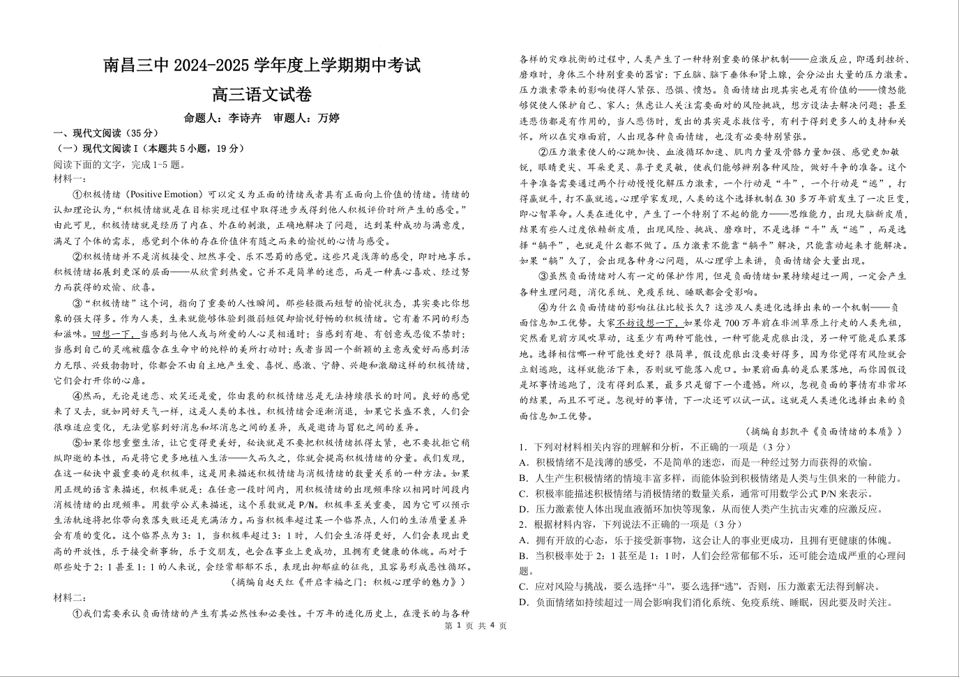 江西省南昌市第三中学2025届高三上学期11月期中考试语文