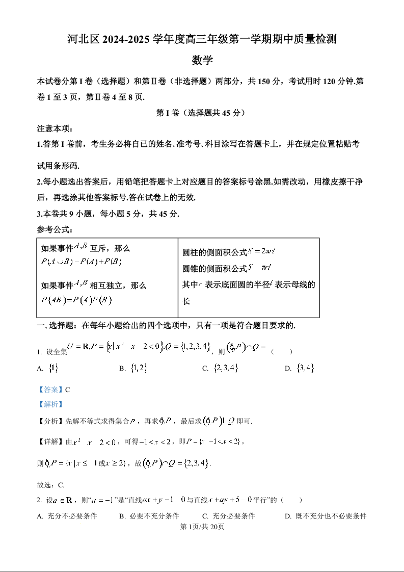 天津市河北区2025届高三上学期期中质量检测数学(精品解析版)
