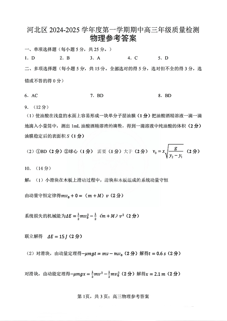 天津市河北区2025届高三上学期期中质量检测物理答案