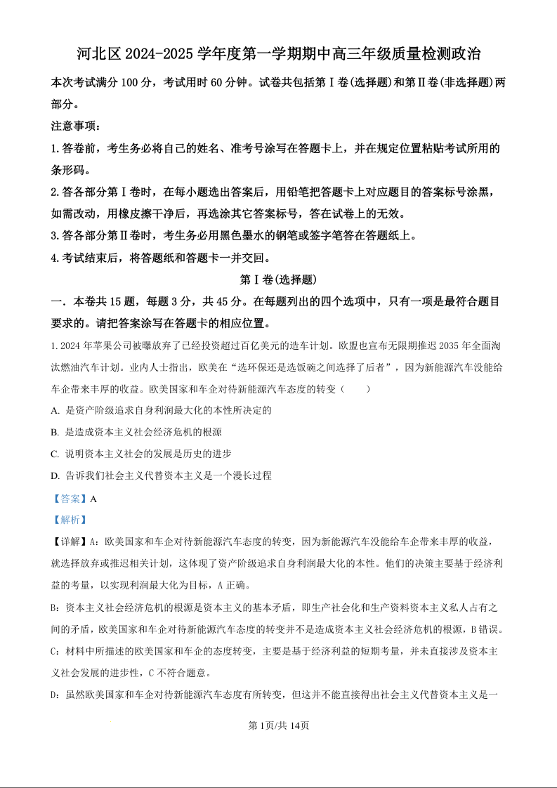 天津市河北区2025届高三上学期期中质量检测政治(精品解析版)